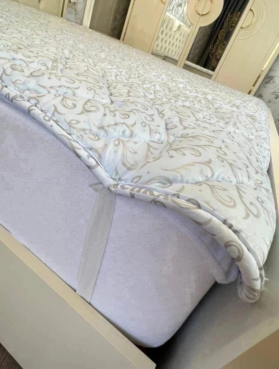 Плотно держится на Матрасе благодаря резинкам по углам с четырёх сторон